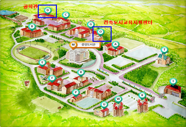 ※ 승용차 이용시: 건축도시교육지원세터(O), 공학관(D) 앞, 주차 후 주차권은 학술대회장소에서 배포
