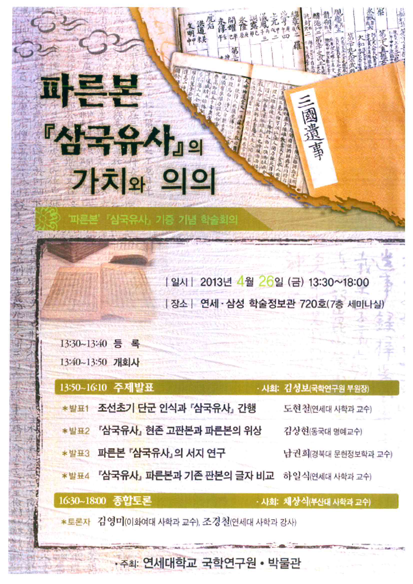지난 1월 16일 공개된 파른본 손보기 교수 소장 삼국유사 잔권에 대한 학술회의가 연세대 국학연구원과 박물관 주최로 개최됩니다.