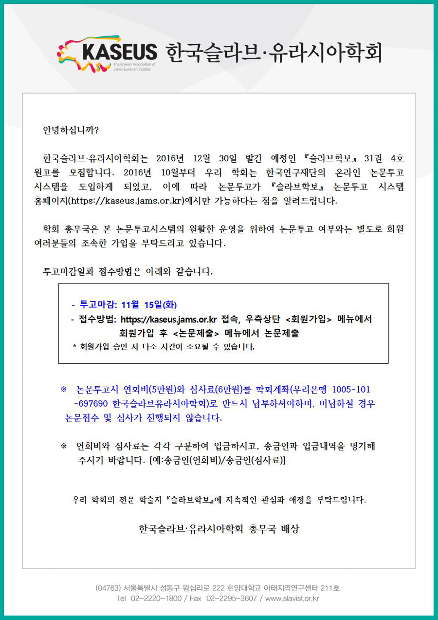 <슬라브학보> 31권 4호 원고모집 안내
