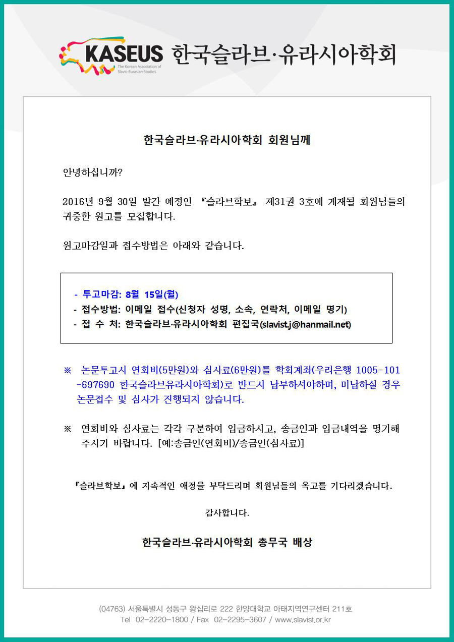 <슬라브학보> 제31권 3호 논문투고 안내